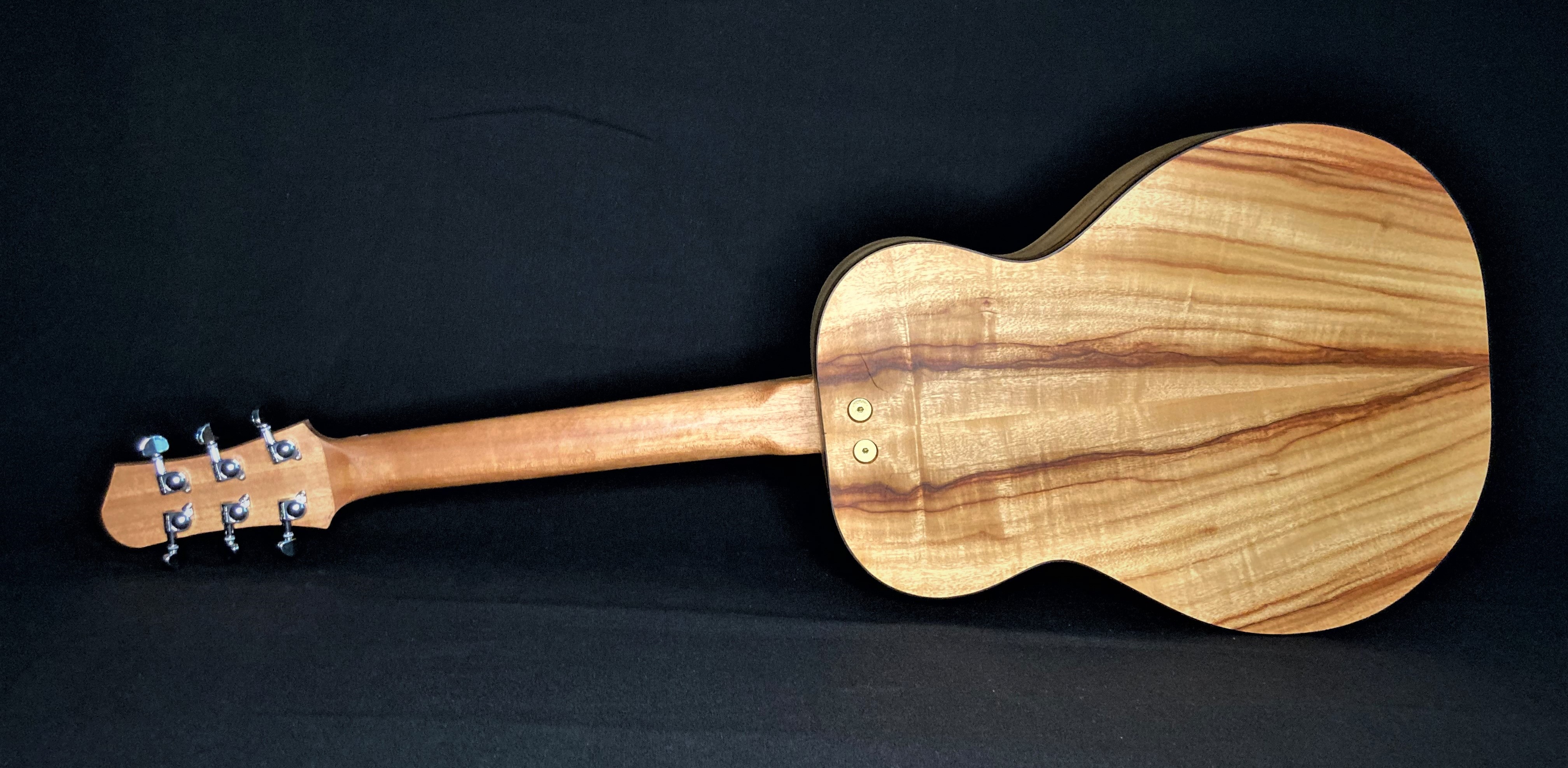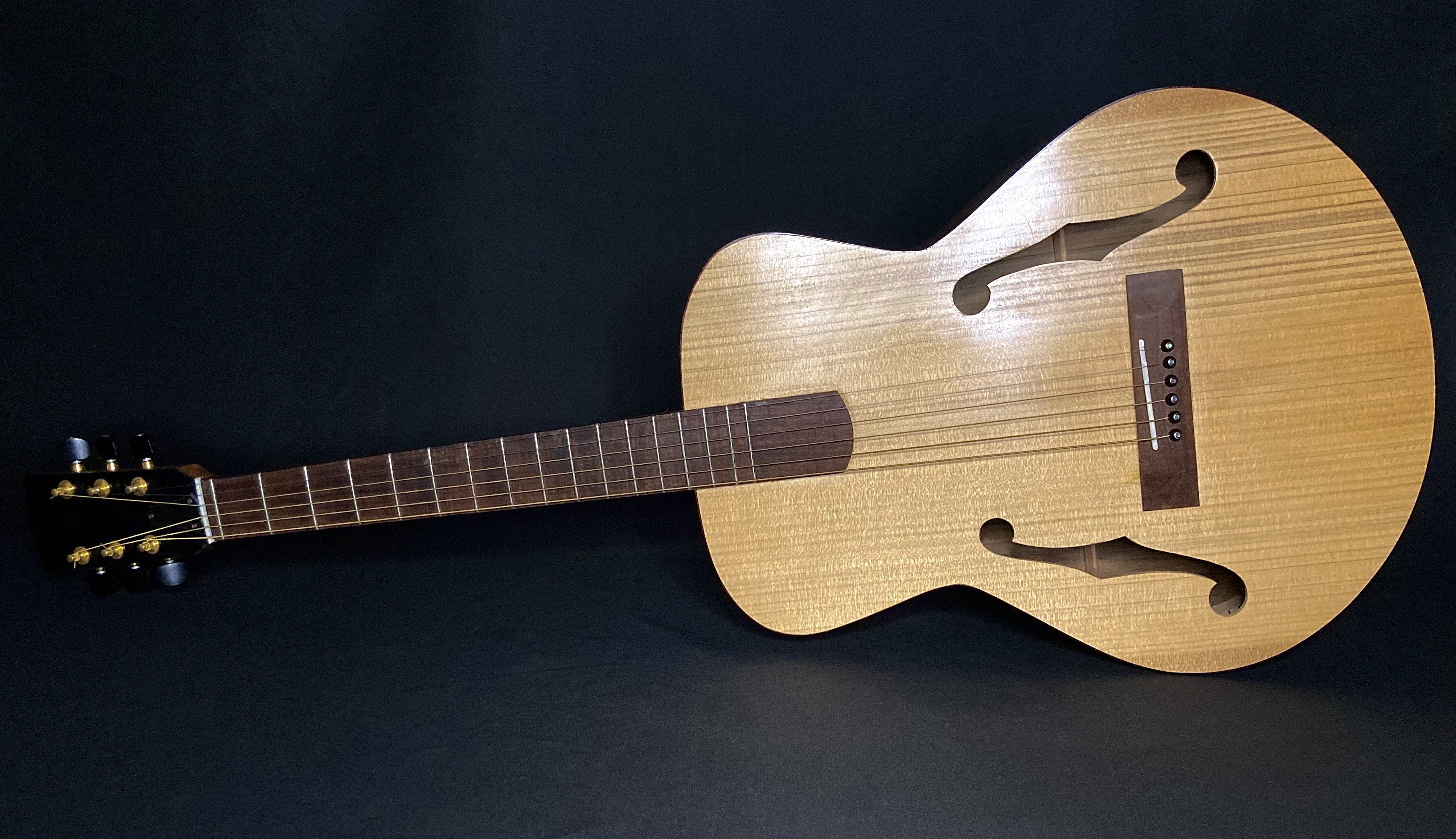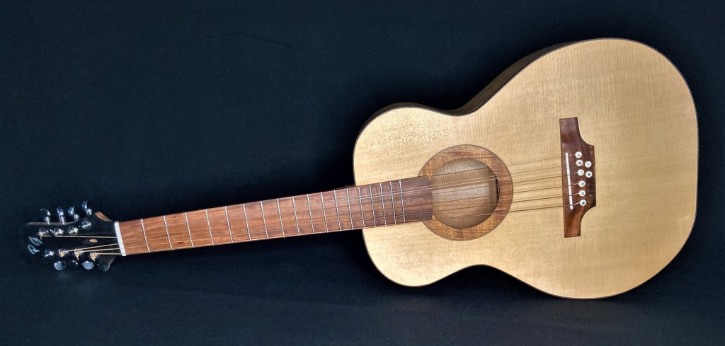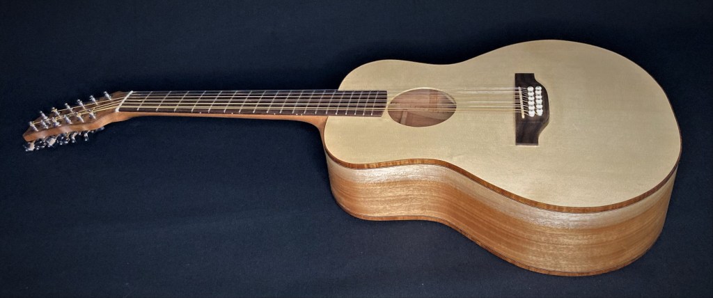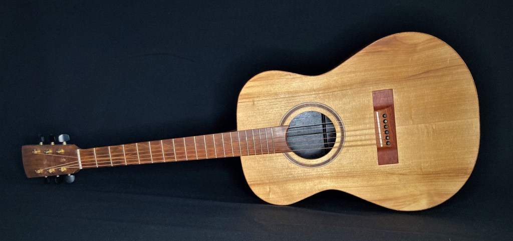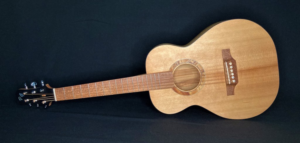 The first guitar I ever made with Chris Wynne in 2011. This was badly damaged in the 2019 Townsville floods but with Chris’s words of “it’s just wood” still ringing in my ears I couldn’t throw it out. A new back, neck, tuners, bridge, binding and soundhole rosette and it still sings to me. OO with red cedar with blackwood fretboardGS mini size 12 string with spruce and QLD mapleOM flat top with bunya and QLD walnut